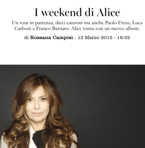 Interview in Marie Claire – 12 . März 2015 von Rossana Campisi Zum nachlesen: http://www.marieclaire.it/Attualita/interviste/Alice-Weekend-tour Alice’s weekend Ein Tour am Start, zehn Songs aber auch Paolo Fresu, Luca Carboni und Franco Battiato: Alice ist zurück mit einem neuen Album Alice singt wieder. Zwei Jahre nach Samsara in Begleitung von drei Herren (Franco Battiato, Luca Carboni, Paolo Fresu) und mit dem Ertrag schöner langer Weekends. Und darüber hinaus dieser lebenslangen Leidenschaft. Alice hat mit 11 Jahren zu singen begonnen, auf dem fünften Festival Internazionale dei Ragazzi di Sanremo, im Juli 1965. Weekend ist der Titel des Albums, das am 11. November vergangenen Jahres bei Arecibo (Alice’s eigene Plattenfirma) erschienen ist, produziert von Francesco Messina und Marco Guarnerio (außer Veleni und La realtà non esiste, die Battiato produziert hat). Zehn neue Titel, die auch auf drei Konzerten vorgestellt werden, die eine Tour im Sommer ankündigen (23. März in Rom, 29. März Florenz, 8. April Mailand) Infos gibt’s bei International Music. Die Voraufführung ist für den 20. März in Azzano Decimo (Pordenone) im Theater Mascherini vorgesehen. In der Zwischenzeit haben wir (während eines Treffens mit der Sängerin) herausgefunden dass: Das Wochenende nützlich ist Auch für die Arbeit einer Sängerin. Das waren die Tage, an denen sie, Marco und Francesco mehr Zeit hatten. Geboren aus einer Notwendigkeit heraus, wurde es zu einer Möglichkeit: Die Beschaulichkeit, in der sich alles abspielte, wäre an einem gewöhnlichen Dienstagnachmittag nie zu erreichen. Es Nostalgie nicht braucht Auch wenn ein Lied den Titel L’umana nostalgia (Die Sehnsucht des Menschen) trägt. Jede Zeit hat ihre ganz eigenen Schwierigkeiten und Möglichkeiten. Wir leben in einer Periode des Übergangs, in der die Sehnsucht lauert, man muss nur darüber hinweggehen um die Bedeutung zu verstehen und das zu nutzen, was in unser Macht steht: das zu ändern, was wir wollen Luca Carboni in Mailand dabei sein wird Beim ihrem Konzert am 8. April im Teatro Nuovo. Er hatte sie für das Duett Farfallina eingeladen, sie lädt ihn jetzt ein Da lontano zu singen (auch Paolo Fresu spielt in diesem Song). Sie sagt, sie schätze ihn seit seinen Anfängen, menschlich wie künstlerisch: sie gemeinsam zu sehen, man ahnt es, wird sehr schön. Die Gifte immer die selben sind Eifersucht, Besitzdenken, Anhaftung, Gier, Hass, Ignoranz. Dies sind die Protagonisten des Songs Veleni, geschrieben von Battiato. Wer sie überwindet, wird immer freier. Sie erklärt, nicht von diesen vergiftet zu sein, allenfalls von anderen. Was die Freiheit angeht, sagt sie, sei sie auf einem guten Weg. Per Elisa noch immer da ist Was ist geblieben von dieser Alice? Alles, sie ist Teil der Frau von heute. Ohne Elise gibt es „den, der nicht einmal rausgeht, um eine Zeitung zu holen“ aber es gibt die, die es weiterhin singt, als wäre es 1981. Deutschland Alice verehrt Sie hat dort mehr Alben verkauft als in Italien. Millionen von Alben. Fragt die Deutschen warum. Vielleicht das richtige Projekt zur richtigen Zeit am richtigen Ort. Auf jeden Fall erwidert Alice die Liebe für dieses Land: Sie wird nie die unverfälschte Art der Ostdeutschen vergessen. Die langen Haare kein Kunstobjekt sind Man darf nur nicht zu viel darüber nachdenken: Gefallen Sie Dir? Dann belassen wir es dabei, sie wachsen. So hat sie es gemacht. Bequeme Kleidung und eine äußere Erscheinung, die (schon immer) die Fortführung dessen sein möchte, was sie ist. Nie eine Priorität. Die Haare hat sie sich nur selten schneiden lassen und dann auch nur, weil sie es nötig hatten: Sie sind das Gesündeste an ihr. Das Buch, das sie derzeit liest, Das Tor heißt Geschrieben hat es der große japanischer Schriftsteller der Moderne (1867 – 1916). Sie mag keine Romane. Aber diese Schrift ist ein alchemistisches Erlebnis. Ich würde gerne wissen, wer unter der Dusche singt Sie nicht, sie sagt: Das mache ich doch schon draußen. Um zu entspannen backt sie aber auch keinen Kuchen, Süßes mag sie nicht allzu sehr und außerdem sei backen doch eher schwierig. Allenfalls mache sie einen schönen Spaziergang. Alternativ, viel Meditation, um innere Spannungen zu lösen. Wenn sie nicht gesungen hätte, sie Astronomie studiert hätte Ja, die Sterne studieren. Nicht Astrologie, Vorsicht. Jemand der Talent-Shows und ähnliches nicht verfolgt indes heute auf sie setzen würde: Chanty. Sie hat sie in einer Radiosendung kennengelernt und hält sie für ein außergewöhnliches Naturtalent und sie wünscht ihr alles Gute: auf dass sie sich entwickelt, auf das sie viel singt. . Wie immer vielen Dank an Alice e dintorni für den Hinweis! .